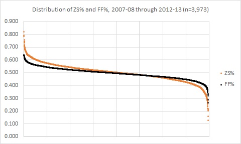 The image above is the distribution of individual offensive zone start percentage (or the percentage of times a player started their shift in the offensive zone) and the distribution of individual Fenwick percentages (shots-for and shots-missed for that player’s team divided by all shots-for and shots-missed, both teams, all tabulated when that player is on the ice). I specifically targeted player season performances wherein the player participated in at least 20 or more games, as that’s roughly around the number of games it takes before these measures start to settle down.
