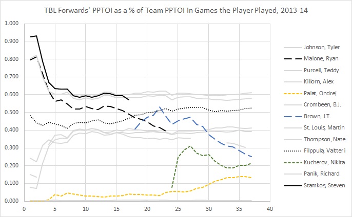 As with the shot graphs, here I’ve expressed forward even-strength ice time as a percentage of team total even-strength time. Notice that St. Louis’s even-strength time hasn’t changed a bit, so you can’t really attribute his drop in shot contributions to a decrease in ice time. I think this might be a strong case for how Stamkos helped create offense both for himself and his linemates. Notice, also, the almost linear increase among Valtteri Filppula, Teddy Purcell, Ondrej Palat, and Tyler Johnson’s minutes. These are the guys stepping up. They are the ones who have helped make this happen: