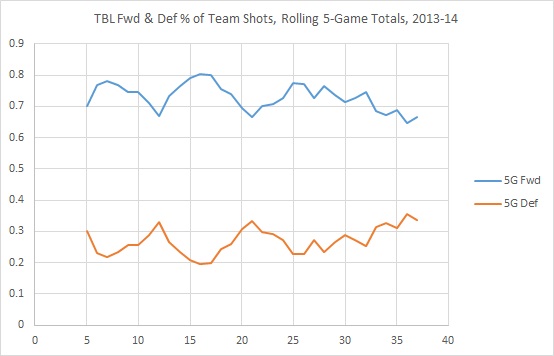 This is essentially the same exercise as the forwards’ graph, only now we’re looking at forwards versus defensemen’s contributions to even-strength shooting. And here, we can see that there’s also a slight uptick in the defender’s role in the offense, an interesting development since that really hasn’t been a trademark to the Lightning’s offense for a few years. It isn’t for lack of talent; Matt Carle and Victor Hedman are both capable offensive players, and in the past Tampa Bay had brought in a number of offensive-minded defensemen to ostensibly improve their blue line offense. So, this uptick has to come from somewhere, so I wanted to see who was increasing their shot-taking: