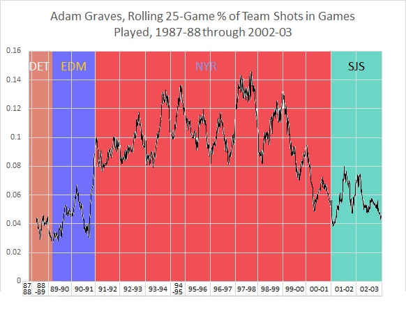 Once again, we’re seeing the similarities between Graves and the other forwards in regards to aging curves, the effect of trades, and even the specter of teams giving up on young talent before their prime. Graves was traded away from Detroit as part of a deal for failed Gretzky-successor Jimmy Carson (he of the historic Gretzky trade to Los Angeles), Graves scored an incredible 52 goals in 1993-94 during the Rangers’ Cup run, cementing his place in the hearts of New York fans. That was his peak, though as you can see above he was a major player in the Rangers offense for years afterward.