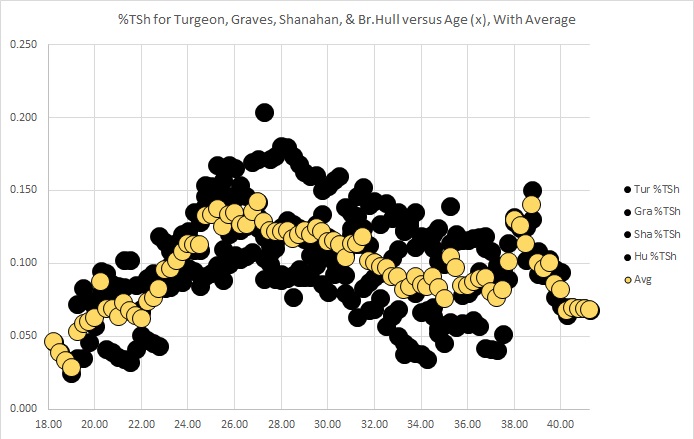 The late spike is, without a doubt, “survivorship bias,” as both Graves and Turgeon drop out of the equation yet Hull and Shanahan forge ahead. Whatever the case, you can definitely see a trend there. Once again, we can compare individual players to their counterparts: