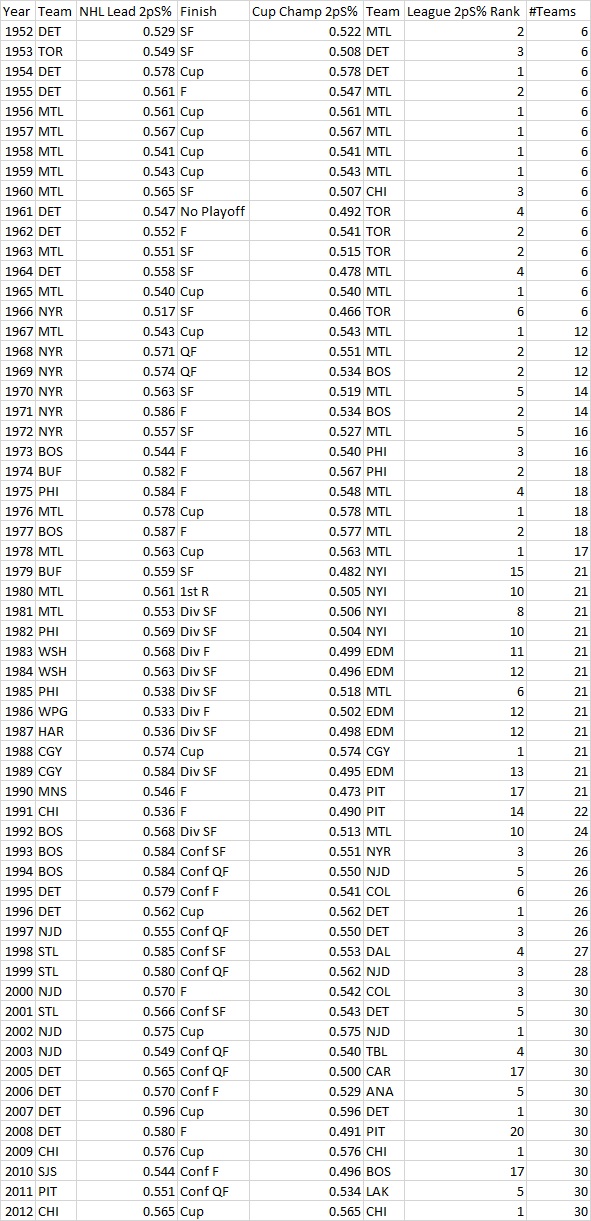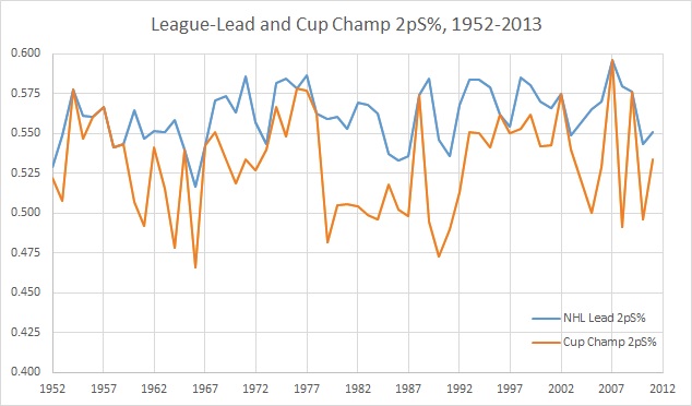 They run together quite nicely if you can see through the noise. You’ll notice, for instance, that your league average (.500) is more often than not the low-water mark, with the notable exception of the 1980s. Overall, in 60 years the leader in 2pS% won the Stanley Cup 15 times, and lost in the Finals 11 times. Only once did the leader fail to make the playoffs, in the case of the 1961-62 Detroit Red Wings. Personally, I’d say making the playoffs should be the primary barometer of success; it typically involves sustainable and/or sustained success, whereas the playoffs themselves can be a bit of a crapshoot by the Cup Finals.