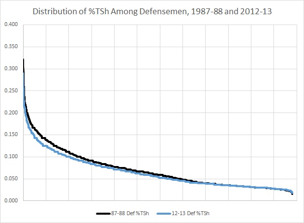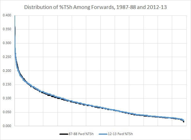 I took data from about 30,000 individual player performances in 1987-88 and about 26,000 in 2012-13; I compared the player’s shot totals to their team totals in those games and derived my %TSh, or percentage of team shots metric, previously used in my piece on Career Charting.