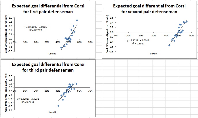 Another test in this article was to see if the trends seen above with forwards in Fig. 1 remain true for defensemen. There have been times where detractors of advance stats have proposed that Corsi is not as significant for defensemen as it is for forwards, yet many of the trends still exist in similar fashion.