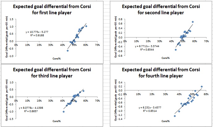“the expected goal differential per minute for different lines is quite different given the same Corsi%.”