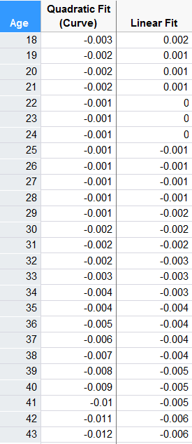 The fit here is slightly worse than the curve (the R^2 drops .04), but the gradual drop in goalie performance is a bit more believable toward later goalie ages than the quadratic fit. Now, the drop in performance relative to average looks like this: