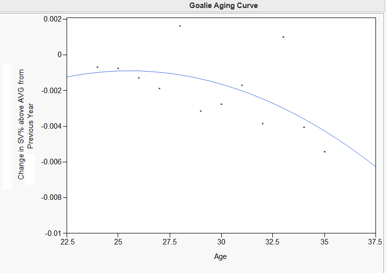 The sample size was from roughly 40-50 goalies from ages 25-34, and the curve above also uses the 27 goalie sample at age 35 and a 31 goalie sample at age 24. Over 800 seasons and this is how small our samples are of goalies who played consecutive seasons (lockouts didn’t help this study).