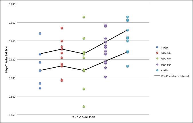 In order to visualize the spread in single-series save percentages, I plotted each series against five groups of regular season 5v5 Sv% L41GP: