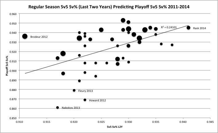 Note that Pearson’s R coefficient for our best predictor is still relatively small. Shedding goalies who appeared in only one series bumps it up to .246, but there’s still a great deal of noise.