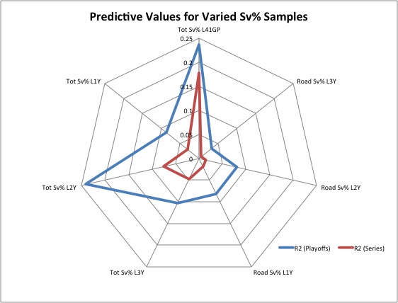 Evidently, limiting Sv% samples to games played on the road did not offer better predictive value. Total 5v5 Sv% over the prior two regular seasons did the best job of predicting total 5v5 playoff Sv%, while 5v5 Sv% over the last 41 regular season games was far and away the best at predicting single series. It’s interesting to note that in both cases, the goaltender’s final 41 GP far surpassed the entire regular season in its ability to predict postseason performance. If the word “momentum” leaves a sour taste in your mouth, call it something else. Over the last two full seasons though, performance in the games leading up to the playoffs did seem to carry over quite well.