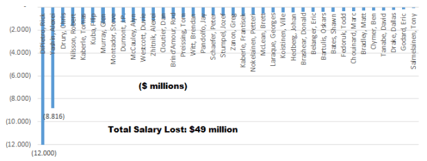 27 players did continue to play in the NHL, but didn’t earn more than they lost to their buy-outs.