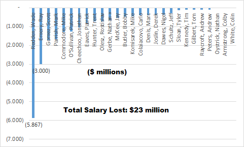 A pair of Glen Sather signings, Gomez and Redden, lost $7.6 million to their buy-outs. Ray Emery lost $3 million, aided by the fact that his age entitled him to only a 1/3 buy-out. Colin White and Colby Armstrong broke even.