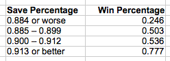 Robert Vollman showed previously how a goaltender’s save percentage impacts a team’s chance to win that game: