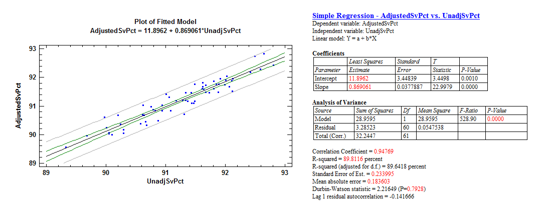 The above regression curve above compares the regular (or unadjusted) save percentage to adjusted save percentage for all goaltenders with at least 40 games played since the 2011-12 season (with all the fun numbers added in the tables for those interested in such things).