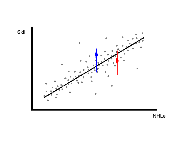 The graph above represents how some may look at and use hockey statistics; the better a player performs in a statistic equates to more skill. This practice can be found in league equivalencies -now more commonly known as NHL equivalencies (or NHLe)- originally contrived here by Gabriel Desjardins.