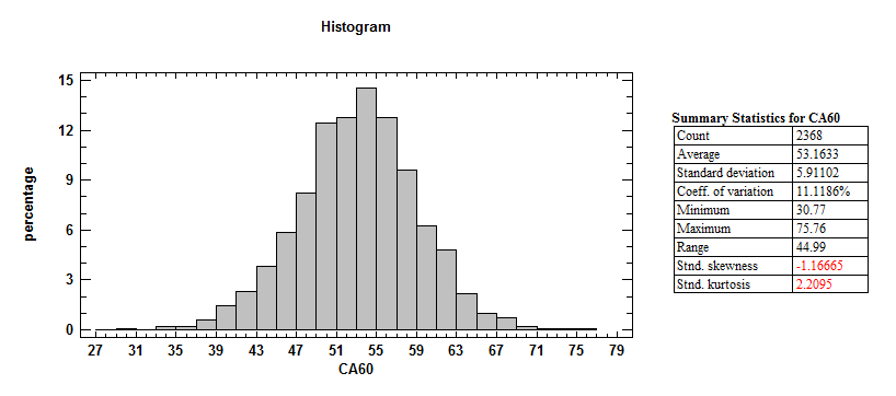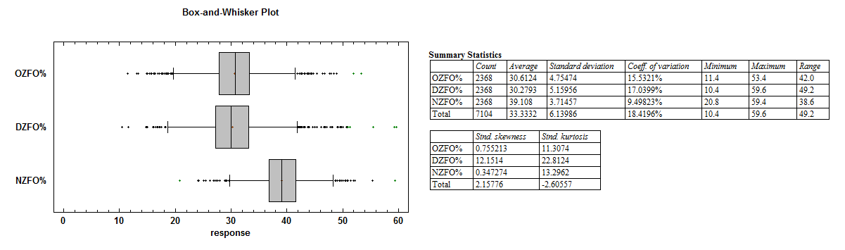 I added a box-and-whisker plot to help you see how a distribution looks like in that form as opposed to a histogram for those not experienced in statistical graphing. Take a few looks as the next two graphs will be of the same ilk.