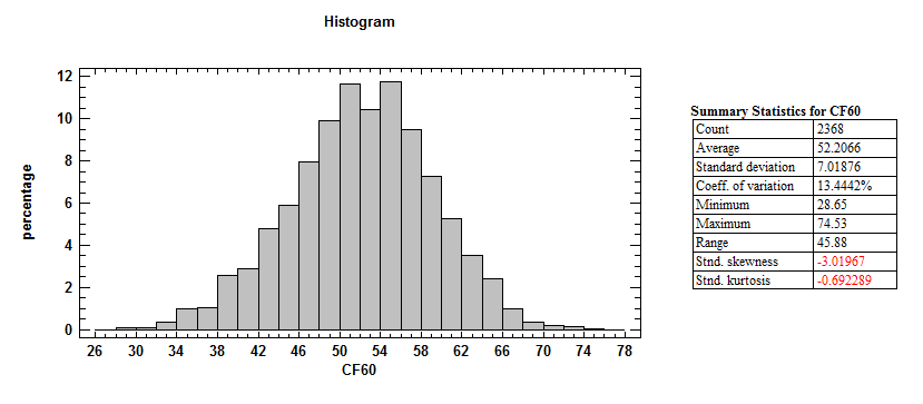 Corsi events for per sixty minutes ends up being far more normal shaped than the previous two statistics. Both the mean and median sit around 52 shot attempts per sixty minutes.