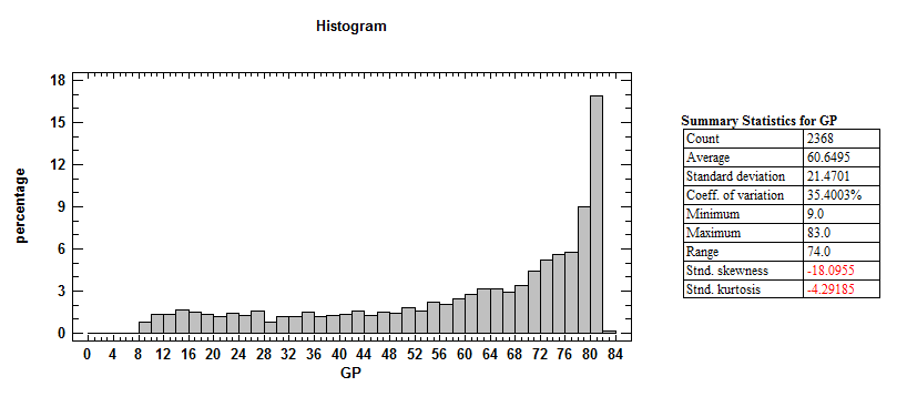 The mean for this data is 60.6 games played, but the median value is 69 games. Less than 20 percent of players play 81 games or more. Interestingly there are three individuals that played 83 games due to being traded within the season. About 36.6 percent of players play less than 60 games.