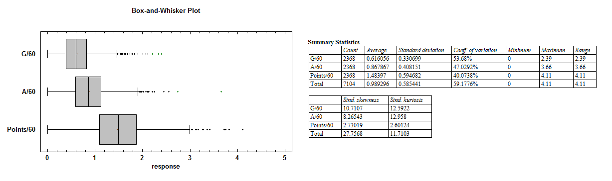 In this case, the medians for goals, assists, and points are 0.60, 0.86, and 1.49. Not a huge difference from the mean, but accuracy and honesty is always necessary for analysis.