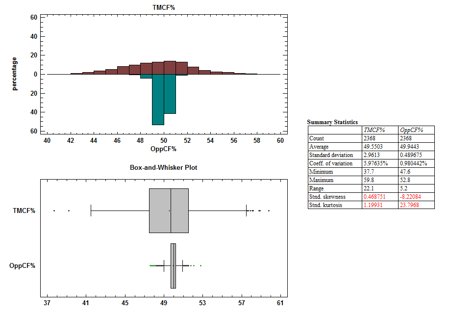 The distribution of teammate Corsi percentage follows a very normal shape, while opponent Corsi does not. Nearly fifty percent of teammate Corsi percentage dwells outside of the opponent Corsi percentage’s limits.