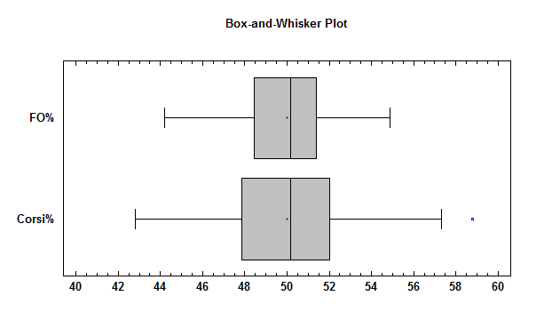Then there is the distribution for Corsi percentage (a statistic well documented for its relationship with scoring chance differentials and puck possession):