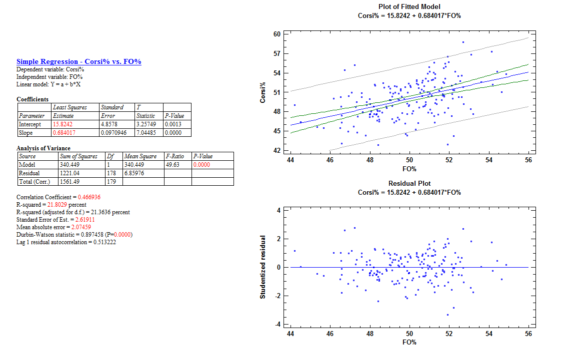 The R-squared value indicates that a team’s faceoff percentage explains about twenty percent of the team’s Corsi percentage.
