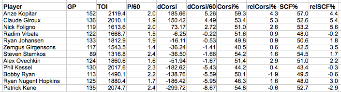 The numbers here are for 5v5 only and for this season and the last combined (including playoffs). Of course, this will under appreciate elite power play players (like Alexander Ovechkin) but it’s for one game, so whatever.
