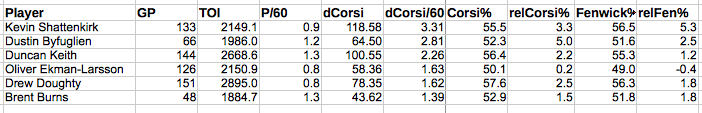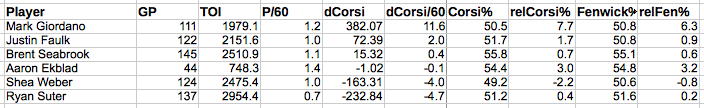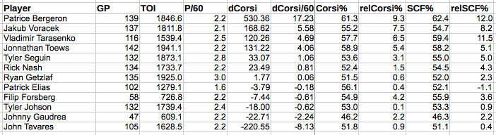 What’s better than one possession line? Two possession lines! While not quite the possession driver of Bergeron, Toews is the second best centre in the shot metrics column on his team. He gets a right winger who scores a few more points per minute than Voracek and pushes the play about equally well. Forsberg isn’t a plus in the dCorsi column, but will likely find it easier to meet expectations with Toews and Tarasenko on his line.