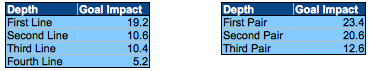 Now compare these goal values to what the spread of talent in shot metrics tends to equate in terms of goal value: