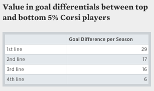 Coaches and management agree, believe it or not. There is a reason “role players” fill the bottom of the roster. As a player’s ice time increases, their impact on-ice becomes more and more important. We can illustrate this by comparing the goal differentials between the top and bottom five percentile in Corsi: