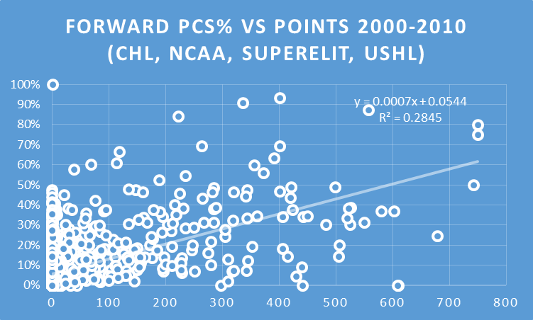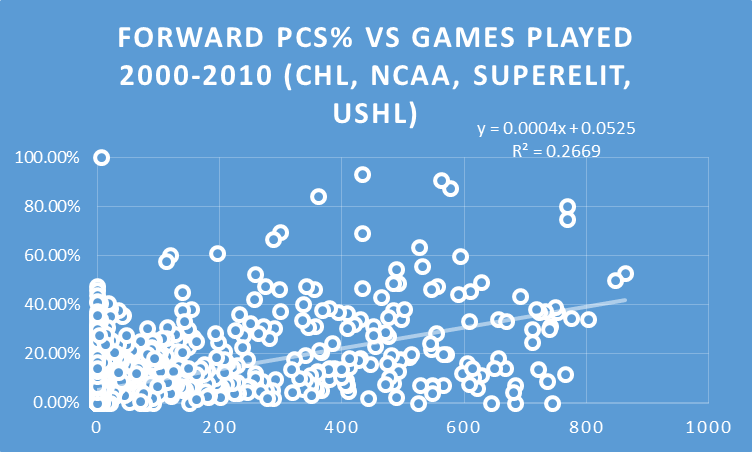 As we can see, PCS has a stronger correlation with both NHL games played and points for forwards than defensemen, which seems to confirm the theory that drafting defensemen, especially earlier in the draft is inherently riskier than selecting forwards.