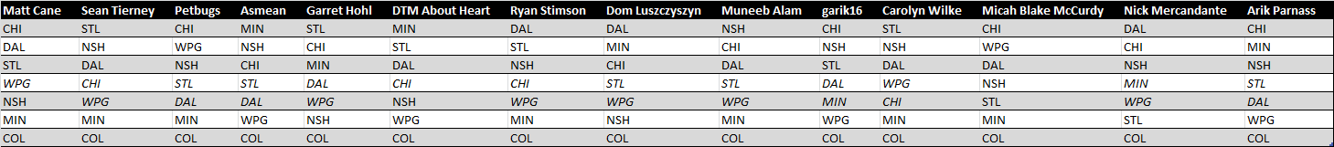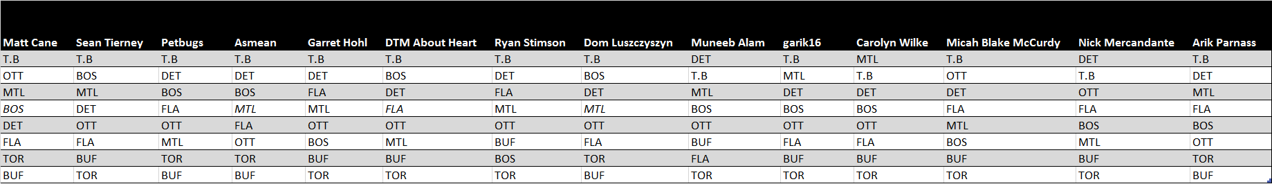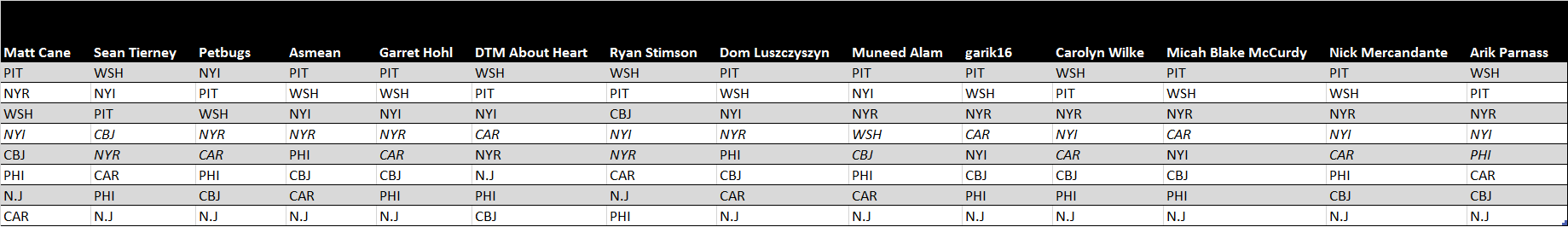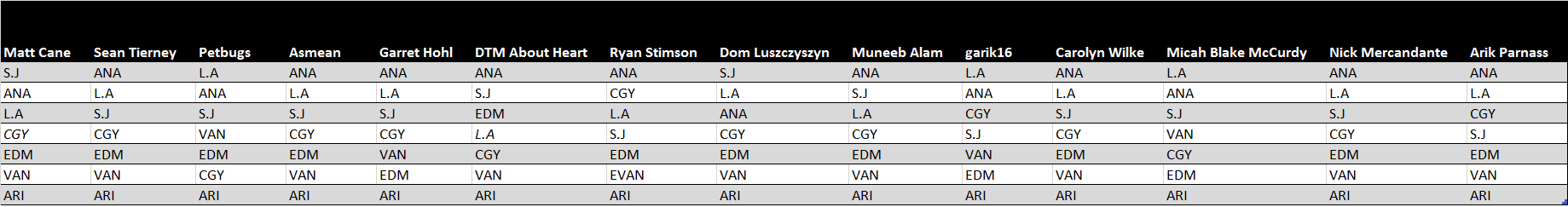 But we’re not done there! Maybe you’re a details person. Perhaps you need to know whether everyone really thinks Colorado will finish last in the Central (spoiler alert, they’re going to). Or maybe you want to double check my math (but really, why wouldn’t you trust a man with a title of standings-list-compiler-in-chief of Hockey Graphs). Each Portable Network Graphics file below (or PNG, as they’re referred to in common parlance) lists off each author’s predicted order of finish by division, with Wild Card clubs conveniently highlighted in italics. Best of all, each list is absolutely, 100% guaranteed to be correct*!