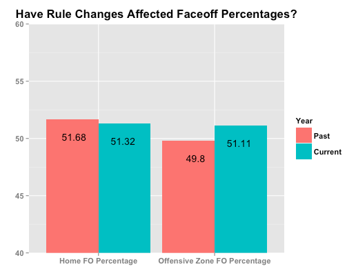 In order to answer that question, I compiled the overall faceoff winning percentage from the 2006 to 2015 seasons for teams in their offensive zone, comparing it to that number so far this year. Out of curiosity, I also found the percentages for home teams before and after the change. Let’s dive in.