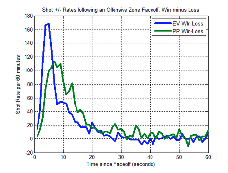 So far this season, there have been 4453 offensive zone wins and 4259 such losses. If we contrast this an expected draws won – based on the percentage from past years – of 4339, it appears the rule change added 114 additional faceoff wins out of our overall sample of 8712. Since approximately 20 percent of game time is spent on the power play, we can use the shot rate and shooting percentage numbers from power plays for 23 of those draws (20 percent of 114), and those at even strength for the other 91.