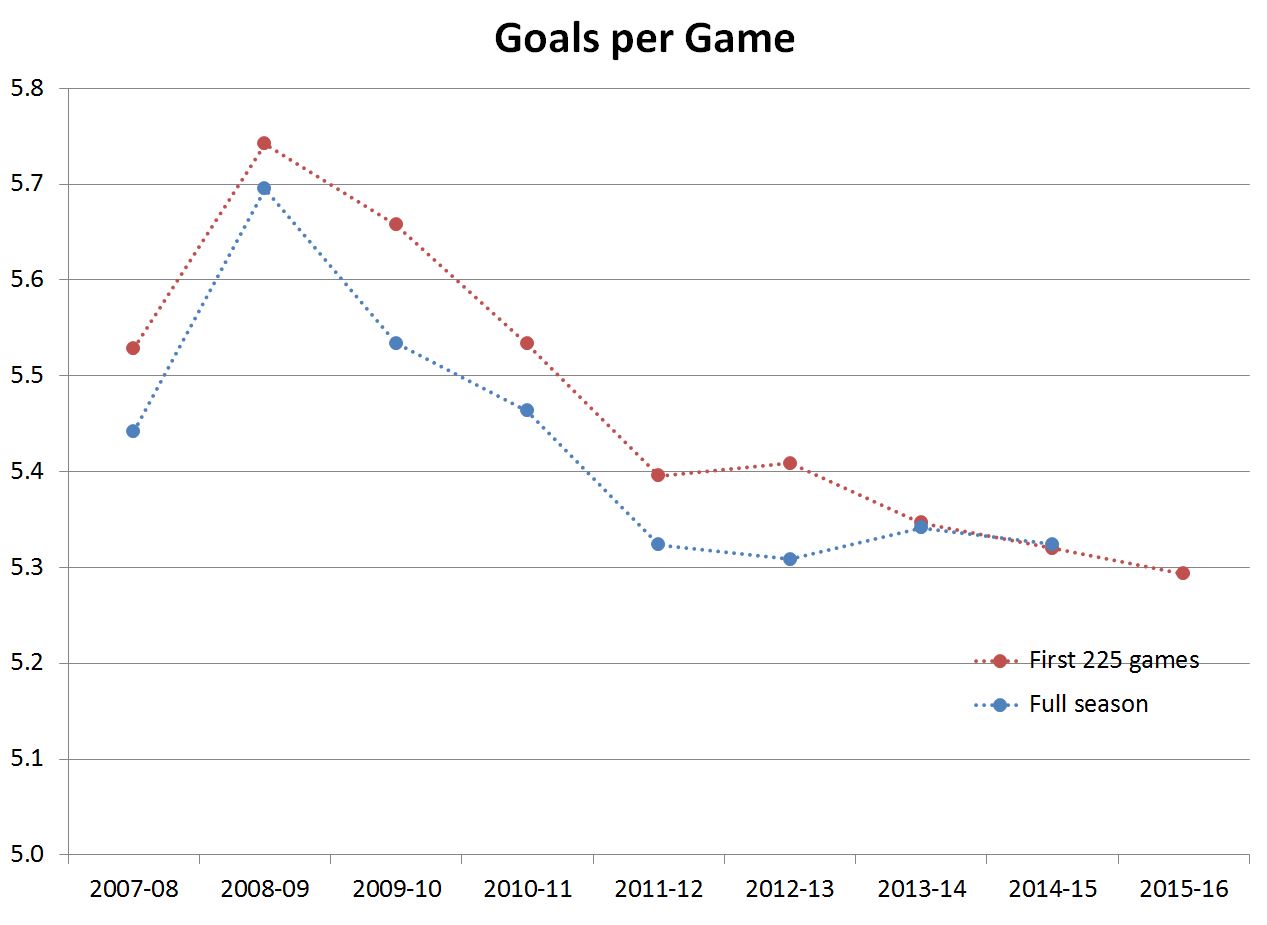 In fact, up until the lockout-shortened season, goal scoring was typically higher in the first 225 games and then drifted down to finish about a tenth of a goal per game lower by the end of the season. So if anything, we should expect the current goal scoring rate to drop as the season wears on.