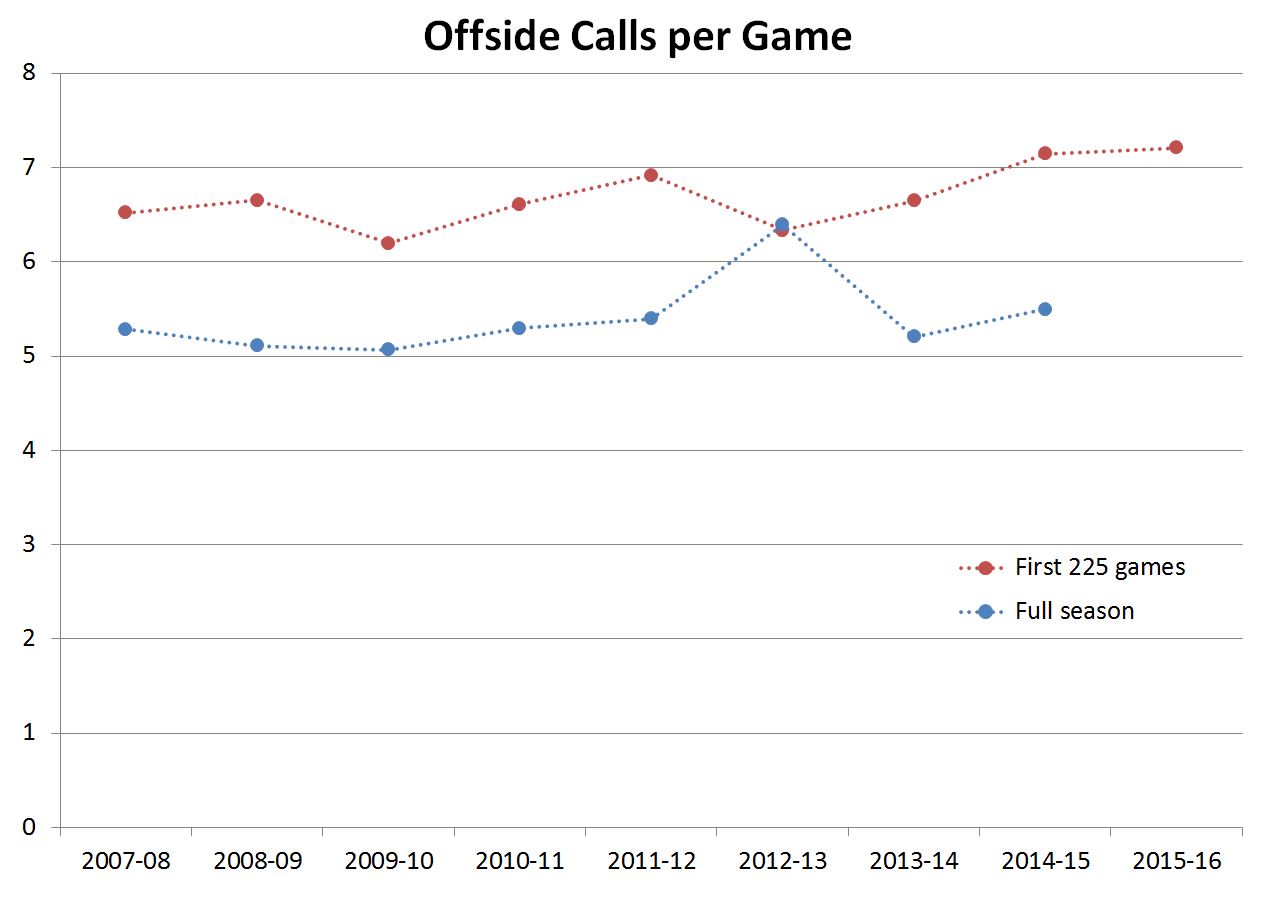 With the exception of the lockout season, offside calls have in the past averaged between 5.1 and 5.5 per game. This year there have been 7.2 offside calls per game.