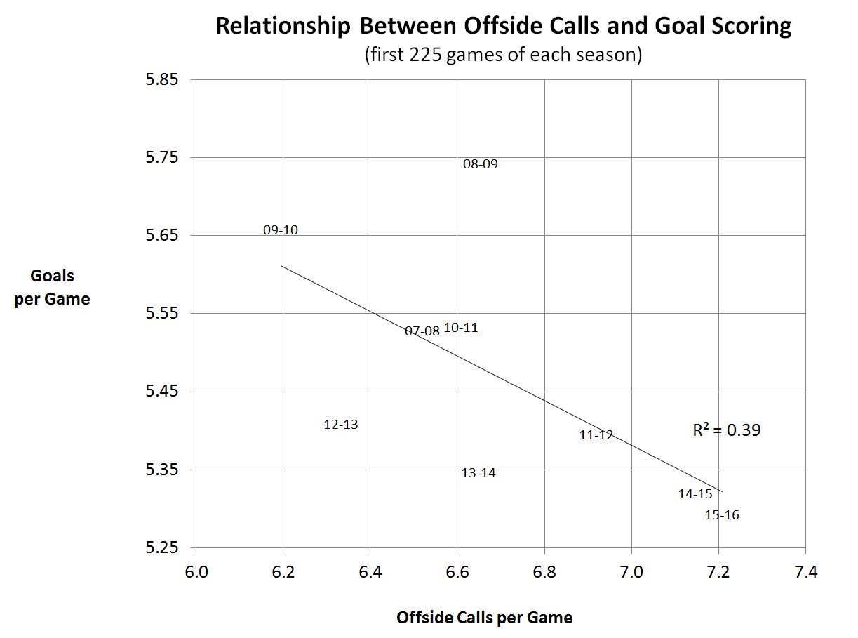 But justified or not, the perceived lack of goal scoring is currently a contentious issue, so let’s look at the relationship between offside calls and goal scoring over the first 225 games of each season: