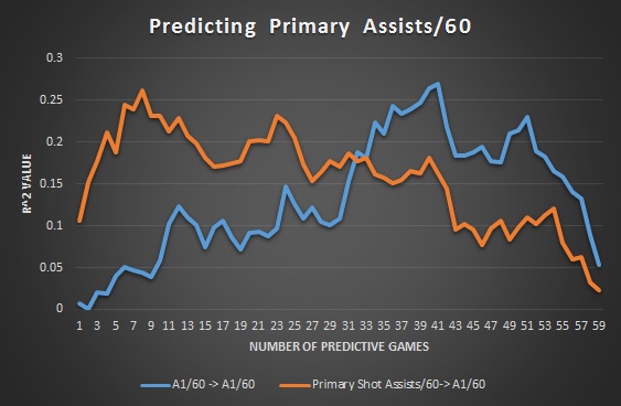 Again, we see how quickly we can predict the remaining Primary Assists a player will score over the course of a season. After only 8 games, the correlation is as its zenith (0.261) and you would need to wait until a player’s 41st game to find a stronger correlation using their A1/60 (0.269). At this point, the season is already half-over.