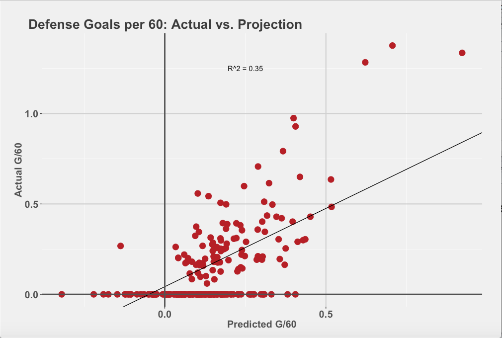 The following graphs illustrate how favorably the forwards and defensemen’s predicted goals per 60 did against actual goals per 60 in-sample.Forward Results