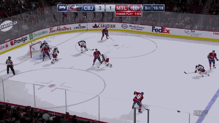 One-timers that cross the royal road are usually also scoring chances, but as with the Alex Galchenyuk goal scored above, they aren’t always. These shots are, however, dangerous because of forcing the goalie to move laterally a great distance at high speeds — one of the most difficult things for a goalie to do. While I have tried to keep each GIF representative of only one type of shot (no overlap), I would be remiss not to note that Brendan Gallagher provides an excellent pass screen prior to this goal. We usually think of screens as being purely on shots, but when it comes to one-timers, pass screens can be just as deadly. The goaltender here is unable to pick up on Galchenyuk’s shot quick enough because he is blocked from tracking the puck as it leaves P.K. Subban’s stick at the left point. Finally, since it’s something I’ve stressed since day 1, note how this play would not have been possible if Subban and Galchenyuk weren’t both playing their off-wings on the respective half-walls.