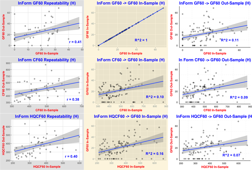 All three of these metrics show high repeatability, and they are very similar in terms of the extent to which they account for in-sample and out-sample goal scoring efficiency in formation. But the sample sizes are small, since we are only talking about half the season for five teams, and a quarter of the season for a sixth — in total approximately 100 goals.