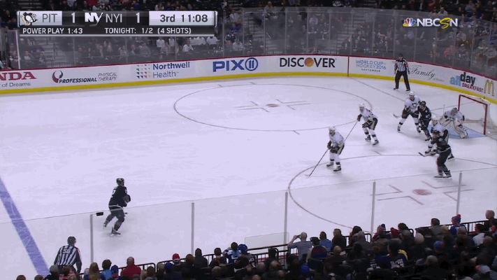 Tipped shots are an extension of screened shots. If you get traffic in front of the net, you are hoping for the possibility that the puck gets tipped on goal, and if not are settling for the screen. In my criteria, I defined tip-pass plays as one-timers, so this category is purely shots that would have been on-goal anyway, forcing a last second adjustment by the goaltender. Anders Lee is one of the best at this skill, as seen above where he manages to tip a Nick Leddy shot into the net despite being tangled up with a Penguins defender in front.