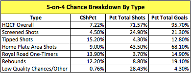 I am cheating a little bit including rebound shots in this definition. After all, you can’t tell a team “when you’re in formation just take rebound shots.” But they are certainly high quality chances and account for a large portion of 5-on-4 goals. So if teams can’t just take rebound shots, how can this knowledge be applied? Well, from past research, we know that certain types of shots produce more rebounds than others. Specifically, we know that screened and tipped shots produce more rebounds, and the data at least suggests that the same is probably true if to a lesser degree for general scoring chance and one-timer shots. Not-so-coincidentally, those are our other four High Quality Chance categories. So rebounds are the fifth and final category, but they are also contained within the other four categories. Take screened, tipped, home plate area and royal road one-timer shots, and the rebound goals as well as the initial goals, will come.