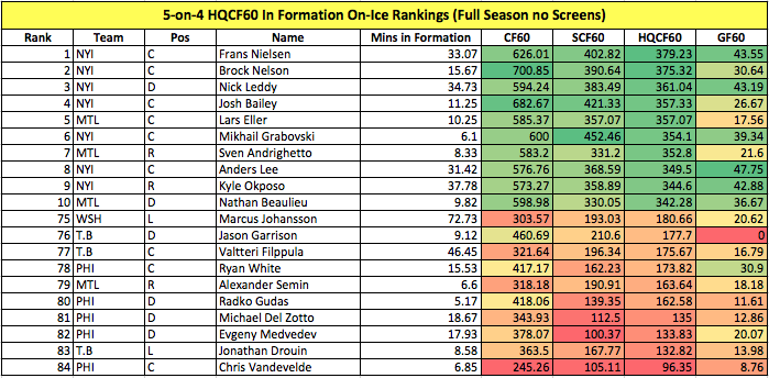 The New York Islanders, despite having trouble with entries, do well once they finally do get set up. The Philadelphia Flyers’ second unit the first half of the year did not perform well, as evidenced by this data. As for Alex Semin, it once again doesn’t appear as though he was helping the Montreal Canadiens power play all that much. You can see the entire full-season rankings here.