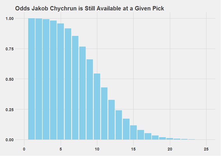 The good news is that we don’t have to be too concerned about exactly which pick will be used for a player. From a General Manager’s point-of-view, it’s valuable enough information to simply know whether a player will still be available at a given pick number. The last chart below takes the final result and turns it into what is called a cumulative probability distribution: it shows the probabilities that Jakob Chychrun will still be available at each pick of the draft.