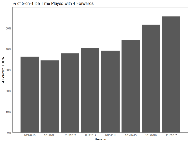 It’s also a strategy that has become more popular over the last few years. 4 forward units have accounted for roughly 56% of the 5-on-4 ice-time this season, up 4% from last year and more than 15% from 5 years ago.[1]