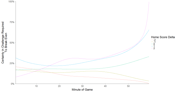The other curves appear mostly where we’d expect[ii] – a team that’s leading needs to have a much higher certainty than a team that’s trailing, which isn’t exactly surprising. What’s interesting to note is how low a team’s certainty needs to be in order to make challenging worthwhile. A team that’s trailing at basically any point of the game needs less than a 15% chance of success to see a positive expected value,. And even a team that’s ahead by 2 goals can still challenge with less than 50% certainty for most of the entire game.