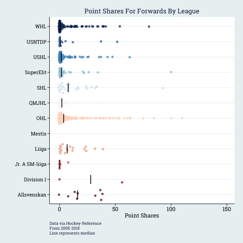 Using all draft picks between 2005-2014, I calculated the median point share for forwards and defensemen drafted from the CHL, USHL, USNTDP as well as the top Nordic professional and junior leagues. I plotted the median (black line) against all individual observations for each league:
