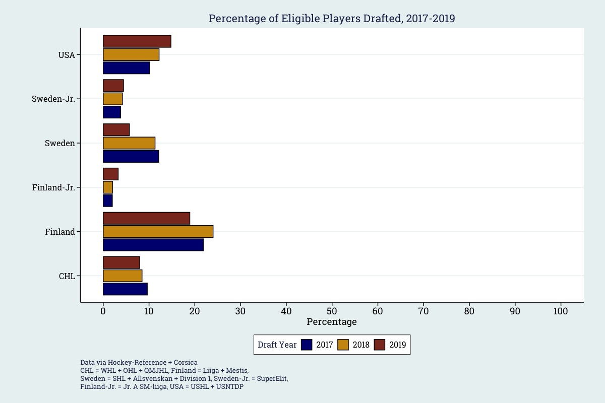 Using data from Corsica.hockey, I identified all draft-eligible players in the 2017, 2018, and 2019 drafts. From there, I looked to see the percentage of players drafted from each league in each respective draft: