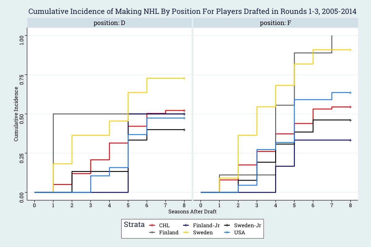 Rounds 4-7 tell a slightly different story. Once again, players making the top professional leagues appear to make the NHL earlier and at a more frequent rate. Interestingly, the SuperElit places ~20% of defensemen and ~25% of forwards in the NHL within seven years, a rate that is slightly better than that of the North American leagues. Jr. A SM-liiga on the other hand had zero of twelve defensemen drafted make the NHL but had ~20% of forwards make the NHL.